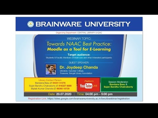 Can open source Learning Management Systems (LMS) like MOODLE be used to elevate the quality of learning in the age of pandemic? To make sure quality remains the defining factor in higher education, IQAC and Central Library of Brainware University organized a webinar on the topic “Towards NAAC Best Practice: Moodle as a Tool for E-Learning” on July 20, 2020. Our guest speaker Dr. Joydeep Chanda( Librarian, Gurudas College, Treasurer, Bengal Library Association) explained how MOODLE can act as an excellent repository for an institution to keep track of learning engagement and online educational activities and therefore make it easier for NAAC to scrutinize their quality later.