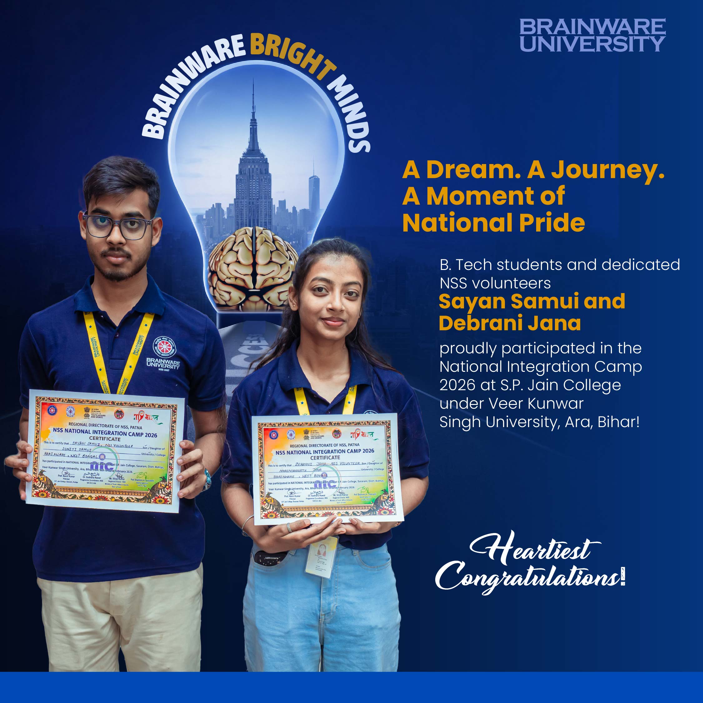 For our tech students and dedicated NSS volunteers Sayan Samui and Debrani Jana, that dream turned into a journey to remember at the National Integration Camp 2026 hosted at S.P. Jain College under Veer Kunwar Singh University.