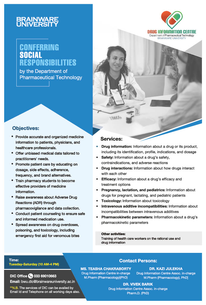 Department of Pharmaceutical Technology was established in 2017 at Brainware University Campus. The Department is well equipped with state-of-the-art infrastructural facilities for teaching and research. Pharmaceutical Technology is increasingly becoming interdisciplinary and occupying its position at the essential point of various scientific queries due to its assortment. The Department of Pharmaceutical Technology at BWU provides high level quality teaching along with highly sophisticated instruments and well-furnished laboratories to cultivate curious and inventive scholars such that they become competent enough to face the challenges from academic as well as from industry.
