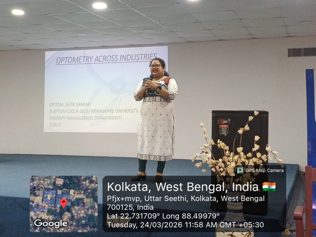The session, titled “Optometry Across Industry,” was delivered by Ms. Jaita Samui, an esteemed alumna of the B.Optom program (2019–2023), who is currently serving as a Therapy Manager (IOL Department) at Zydus.