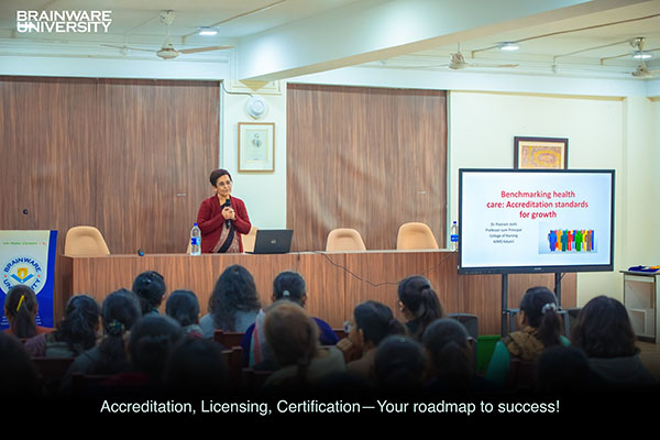 The Institute of Nursing and the Internal Quality Assurance Cell (IQAC) at Brainware University organised an insightful seminar on ‘Benchmarking Health Care: Accreditation Standards for Growth’. Dr. Poonam Joshi, Professor cum Principal, AIIMS Kalyani, delivered an engaging session on the Accreditation process for educational institutions, emphasising nursing programmes. She discussed the Indian Nursing Council (INC) accreditation of Brainware University, NABH accreditation for hospitals, and the essential steps of Accreditation, Licensing, and Certification. Dr. Joshi also stressed the importance of renewing nurses’ licenses every five years for professional growth and credibility!