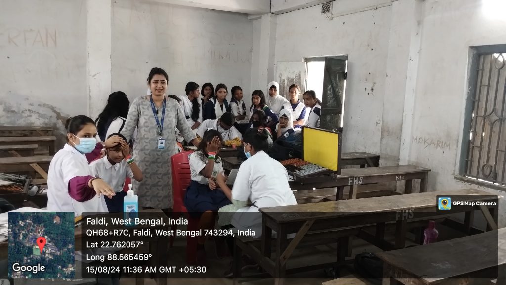 A vision screening camp was organized and smoothly conducted on 15th August 2024, Thursday at Faldi High School, Faldi. A total of 84 participants are there including 76 patients, 6 students and 2 faculty members. Bachelor of Optometry 3rd year students were engaged in the vision screening process. They detected the vision related issues of the students and also referred patients when required. Students also took active participation in counseling the patients and their parents about the vision related issues that parents may not be aware of.