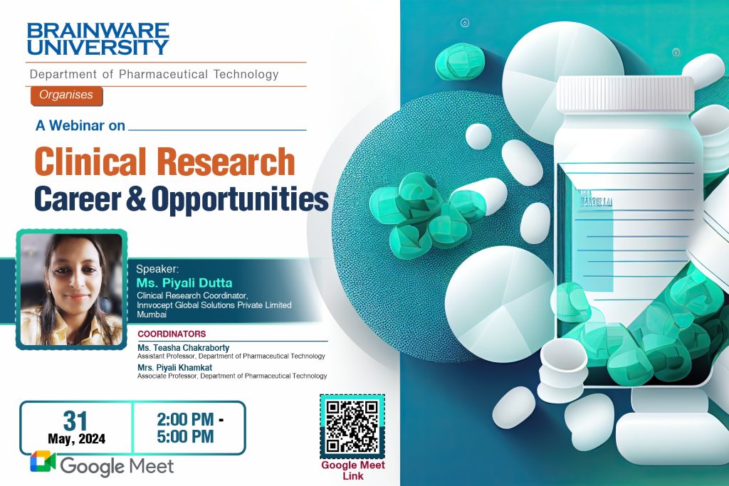 The Department of Pharmaceutical Technology, Brainware University, organized a webinar on “Clinical Research: Career and Opportunities” on May 31, 2024, from 2:00 PM to 5:00 PM via Google Meet. The session was conducted by Ms. Piyali Dutta, Clinical Research Coordinator at Invoccept Global Solutions Private Limited, Mumbai. The webinar provided valuable insights into the scope, challenges, and professional pathways in clinical research, guiding students toward diverse opportunities in the pharmaceutical and healthcare industries.