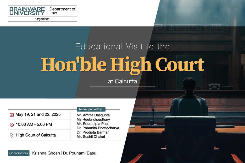 The Department of Law, Brainware University, organised an educational visit to the Hon’ble High Court at Calcutta on May 19, 21, and 22, 2025, from 10:00 AM to 5:00 PM. The visit aimed to provide students with first-hand exposure to judicial proceedings and courtroom decorum. Students observed live hearings, interacted with legal professionals, and gained practical insights into court functioning, case documentation, and procedural law. The visit was accompanied by Mr. Amrita Dasgupta, Ms. Reeta Choudhary, Mr. Souradipta Paul, Dr. Paramita Bhattacharya, Dr. Prodipta Barman, and Mr. Sushil Dhakal, and coordinated by Ms. Krishna Ghosh and Dr. Pounami Basu.
