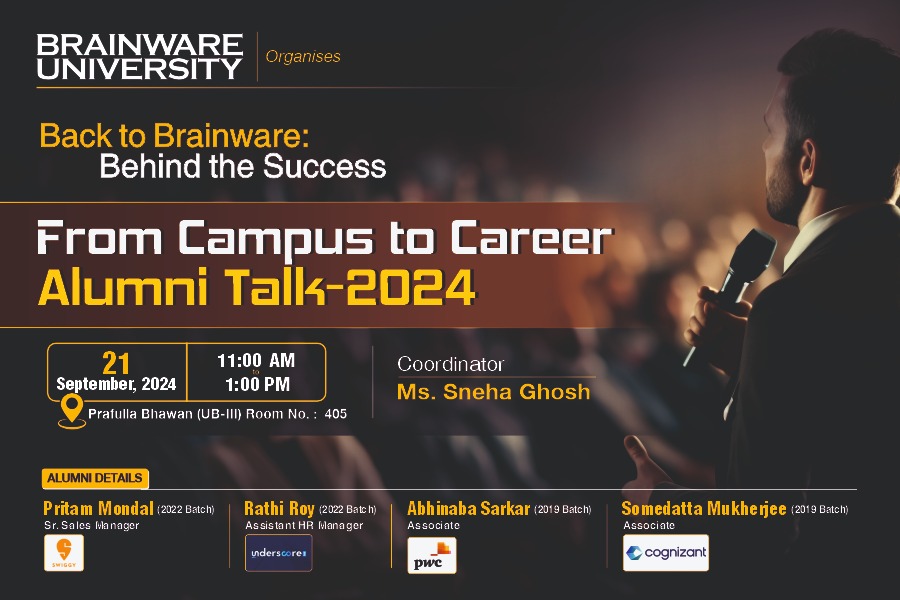 Brainware University organized an event titled “Back to Brainware: Behind the Success – From Campus to Career Alumni Talk-2024” on September 21, 2024. The talk was held from 11:00 AM to 1:00 PM in Prafulla Bhawan (UB-III), Room No. 405. The event featured four alumni speakers: Pritam Mondal (2022 Batch, Sr. Sales Manager at Swiggy), Rathi Roy (2022 Batch, Assistant HR Manager at underscores.in), Abhinaba Sarkar (2019 Batch, Associate at PwC), and Somerdatta Mukherjee (2019 Batch, Associate at Cognizant). The program was coordinated by Ms. Sneha Ghosh.