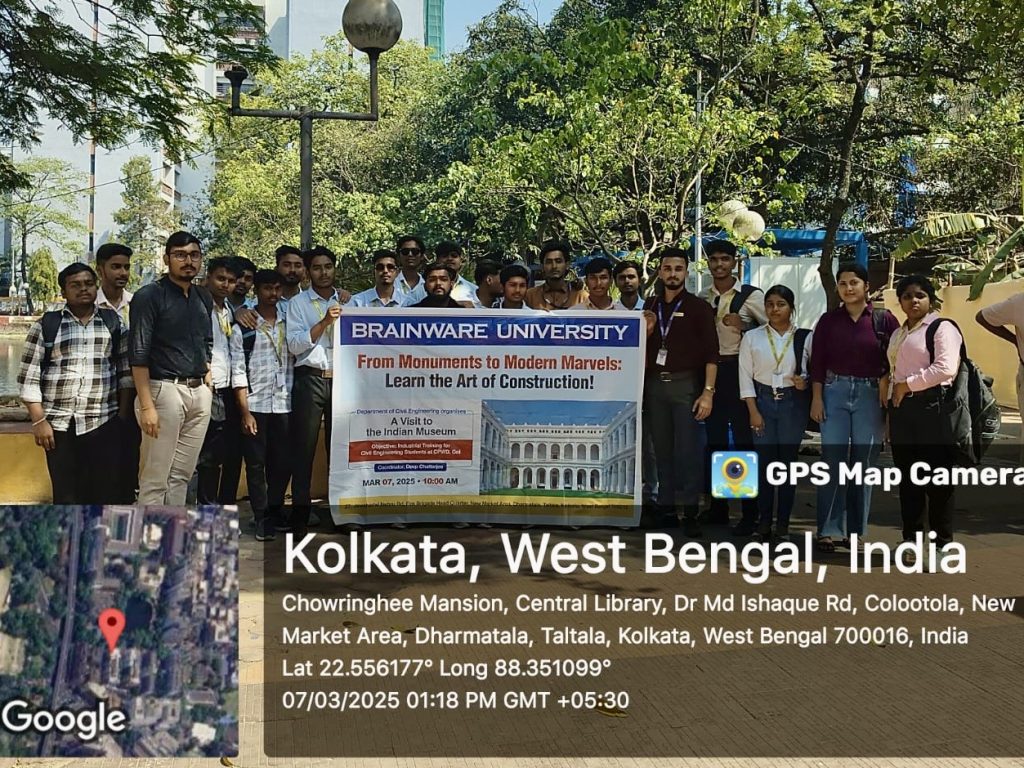The Department of Civil Engineering, Brainware University, organised an industrial visit titled “From Monuments to Modern Marvels: Learn the Art of Construction” on March 7, 2025, at the Central Public Works Department (CPWD), Government of India, and the Indian Museum, Kolkata. The visit aimed to provide students with practical exposure to construction techniques, heritage conservation, and modern infrastructure development. Participants observed on-site processes and interacted with professionals from CPWD, gaining valuable insights into project management, structural design, and sustainable construction practices.