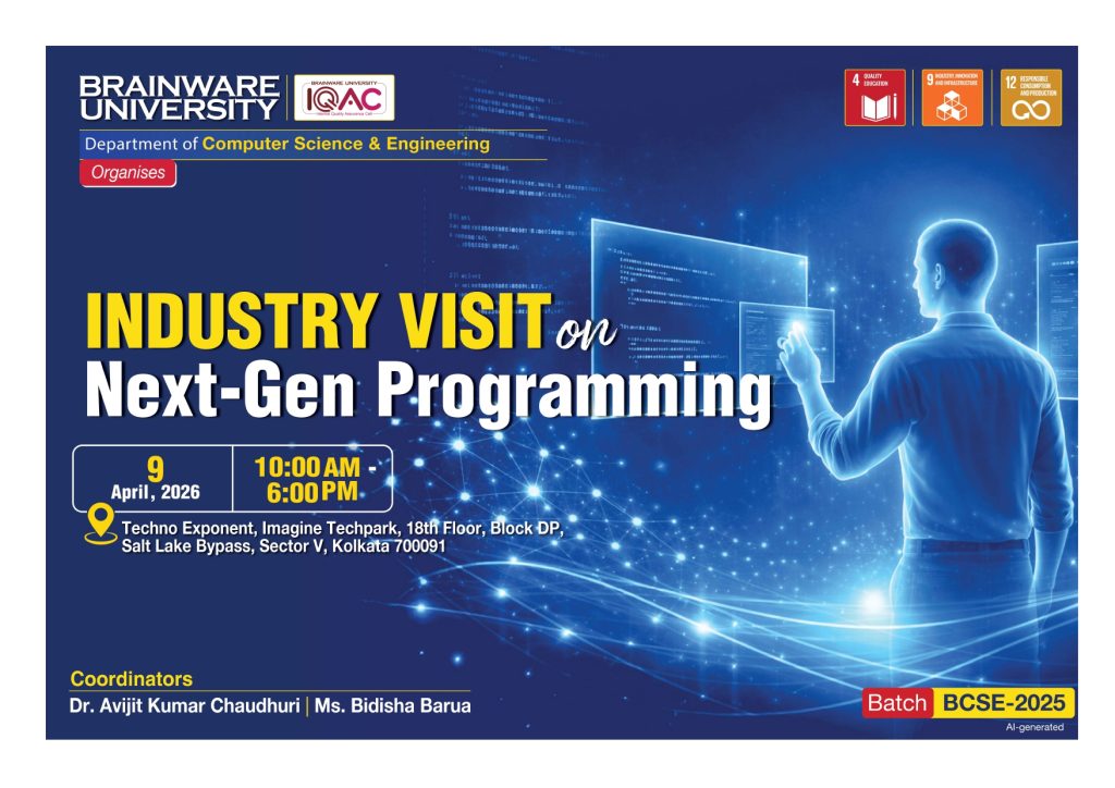 The Computer Science and Engineering departments organized an industry visit on “Next-Gen Programming” to provide students with exposure to emerging technologies shaping the future of software development. The visit highlighted how AI-driven development, low-code platforms, and modern architectures are transforming the tech landscape while contributing to Sustainable Development Goals such as Quality Education (SDG 4), Industry, Innovation and Infrastructure (SDG 9), and Responsible Consumption and Production (SDG 12).