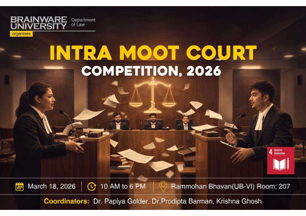 The Intra Moot Court Competition 2026, organized by the School of Law at Brainware University, was held on 18th March 2026 at the Moot Court Hall (UB VI). The event served as an engaging academic platform to simulate real-life courtroom experiences and promote experiential learning in legal education.
