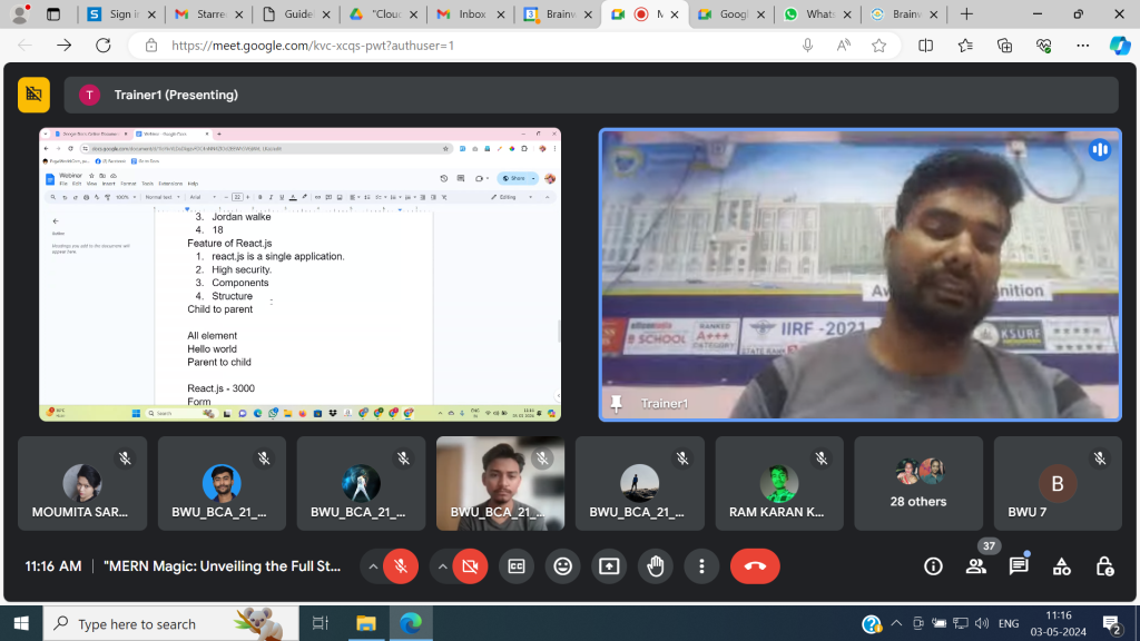Brainware University was a resounding success. Led by Mr. Asraf Ali, participants gained comprehensive skills in MongoDB, Express.js, React.js, and Node.js development. The workshop fostered collaboration, provided hands-on experience, and inspired confidence in attendees to tackle future web development challenges. Overall, it was a transformative learning experience that equipped students with valuable tools for their academic and professional journeys.