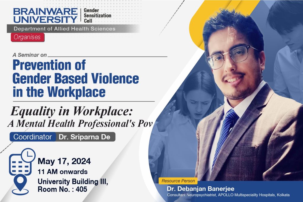 The Department of Allied Health Sciences, in collaboration with the Gender Sensitization Cell, Brainware University, organized a seminar on “Prevention of Gender-Based Violence in the Workplace” on May 17, 2024, at 11 AM onwards in University Building III, Room No. 405. The session, titled “Equality in Workplace: A Mental Health Professional’s POV”, was conducted by Dr. Debanjan Banerjee, Consultant Neuropsychiatrist, APOLLO Multispeciality Hospitals, Kolkata. The seminar focused on promoting gender equality, mental well-being, and creating a respectful and inclusive work environment.