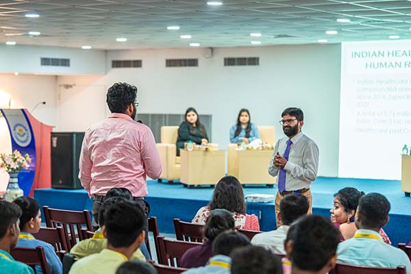 The roaring greeting from Gangavarapu Anjaneya Reddy, Group HR Head, AMRI Hospitals, instilled huge energy among the Hospital Management students. Reddy was present to interact with the students on the ‘Opportunities and Best Practices of HR in Healthcare’.