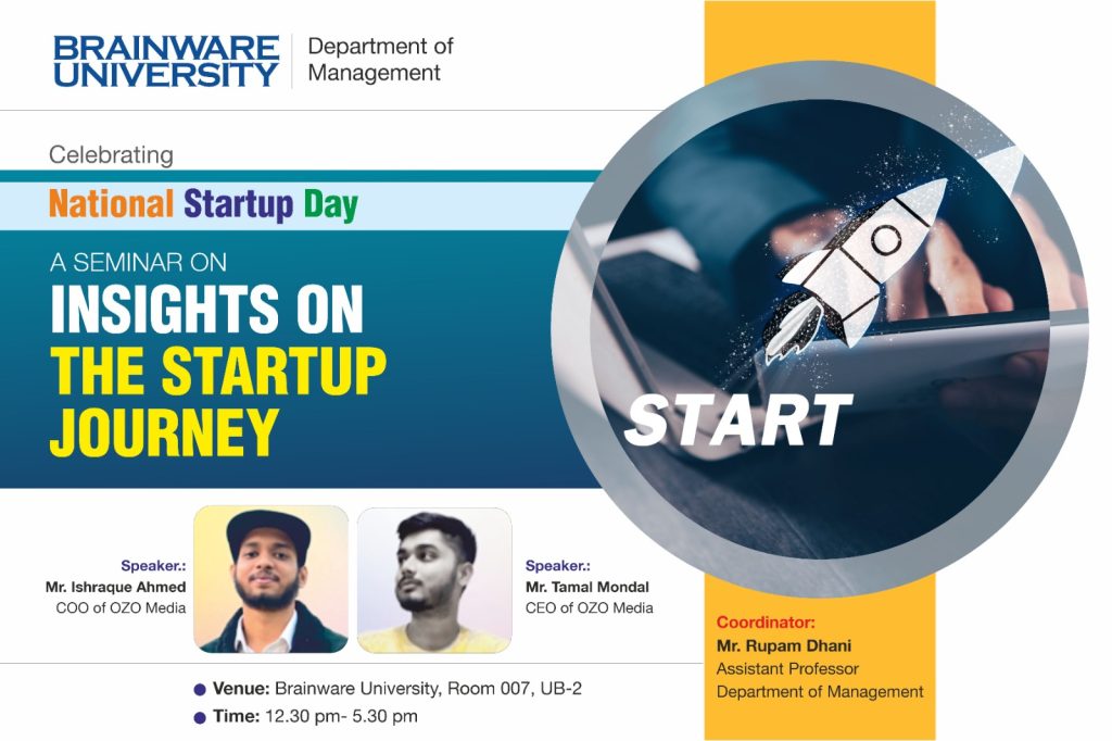 The Department of Management, Brainware University, organized a seminar titled “Insights on the Startup Journey” to celebrate National Startup Day. The session featured Mr. Ishraque Ahmed, COO of OZO Media, and Mr. Tamal Mondal, CEO of OZO Media, as the guest speakers.