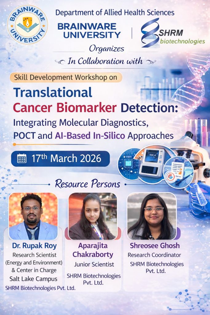 The Department of Allied Health Sciences, Brainware University, successfully organized a one-day skill development workshop on “Translational Cancer Biomarker Detection: Integrating Molecular Diagnostics, POCT & AI-Based In-Silico Approaches”. Conducted in collaboration with SHRM Biotechnologies, the workshop aimed to enhance participants’ knowledge and practical skills in advanced cancer diagnostics while bridging the gap between research and clinical applications.