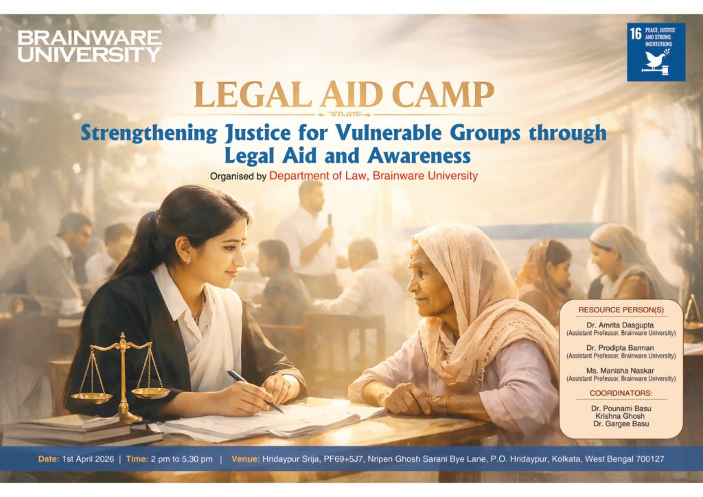 On 1st April 2026, the Department of Law at Brainware University organized a Legal Aid Camp at Hridaypur Srija to promote legal awareness and access to justice among marginalized communities, in alignment with SDG 16: Peace, Justice, and Strong Institutions.