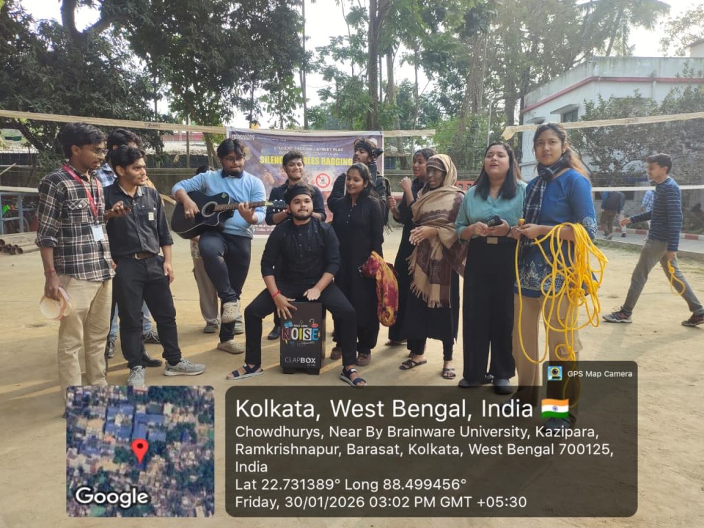 The Communication Club of Brainware University organized the Students’ Theatre / Street Play (Nukkad Natak) Competition on the theme “Silence Enables Ragging.” The event aimed to spread awareness against the social menace of ragging and to encourage students to voice their thoughts on building a respectful and harmonious campus environment.