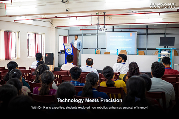 Building on the insights from the first session, this segment, organised by the Department of Allied Health Sciences, offered students an even deeper dive into the practical applications of laparoscopy and robotic assisted surgery. Under the expert guidance of Dr. Tapas Kumar Kar, Consultant Surgical Oncologist at Apollo Hospitals, Kolkata, participants got hands on experience in minimally invasive surgical techniques, robotic controls, and real world applications of these innovations!