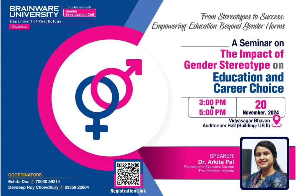 The Department of Psychology, in collaboration with the Gender Sensitization Cell, Brainware University, organized a seminar on “The Impact of Gender Stereotype on Education and Career Choice” on November 20, 2024, from 3 PM to 5 PM at Vidyasagar Bhavan Auditorium Hall (UB II). The session was conducted by Dr. Arkita Pal, Founder and Executive Director of The Inference, Kolkata, who discussed how societal stereotypes influence academic and professional decisions. Coordinated by Eshita Das and Devdeep Roy Chowdhury, the event aimed to promote awareness on breaking gender norms and empowering individuals to make unbiased career choices.