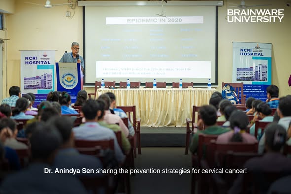 We were honoured to have Dr. Anindya Sen, Chief Medical Officer at Netaji Subhas Chandra Bose Cancer Hospital, share invaluable insights on cervical cancer prevention with our future healthcare leaders at Brainware University. From understanding the risks to learning life-saving strategies, it was an eye-opening session for all!