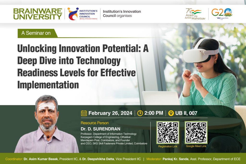 A seminar on “Unlocking Innovation Potential: A Deep Dive into Technology Readiness Levels for Effective Implementation” was organized by the Institution’s Innovation Council (IIC) of Brainware University on February 26, 2024, at 2:00 PM in UB II, Room 007.